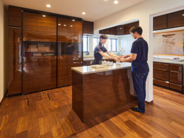 作業用のカウンターをお揃いのデザインにしたことですごくオシャレになりました。ご家族で楽しむお料理の盛り付けをしたり、ご夫妻でお料理を作ることも多くなったそうです。