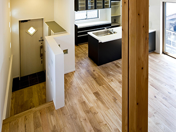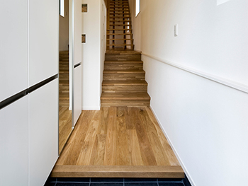 玄関の位置と高さを変え、駐車スペースを確保しました。 道路との段差は、玄関ホールの階段で解消しました。 玄関収納もたっぷり確保し、奥行きと高さのある素敵な空間を作りました。 |